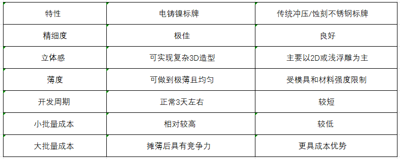 電鑄可以生產(chǎn)出壁厚均勻且極薄(0.04mm起) 的標牌,既節(jié)省材料、減輕重量,又因為鎳本身的高強度而保持足夠的結(jié)構(gòu)剛性。