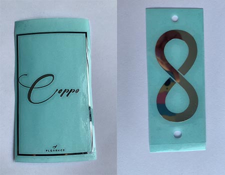二是將不干膠先印到轉移紙上,干燥后將轉移膜上的電鑄文字及圖案貼到膠膜上,壓緊后將不干膠膜轉移到電鑄文字及圖案的背面。